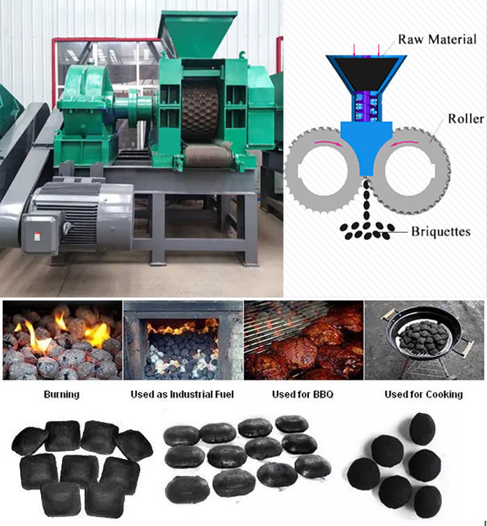 Charcoal powder briquette machine is used to process the charcoal powder into charcoal briquettes. Mature technology, stable performance and easy operation, our charcoal powder briquette machine enjoys extensive popularity among clients. With high Calorific value and density, the charcoal briquettes produced by our charcoal powder briquette machine are most suitable for industrial boilers, home heating, barbecue, etc.
