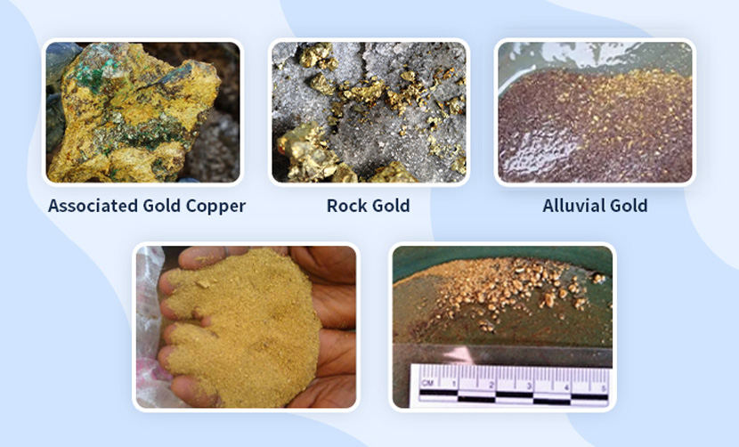 Suitable Materials: alluvial/placer gold, rock gold, etc. The gold concentrate of placer gold ore has a high content and mostly exists in the form of sand grains. Therefore, gravity separation is often used when sorting. After pretreatment, desliming and washing of ore, coarse gold ore particles can be directly obtained.